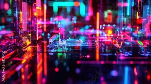 Abstract digital city glowing with vibrant neon lights and reflective surfaces.