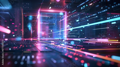 Abstract digital corridor with neon lights and futuristic data streams. Perfect for technology and innovation concepts.