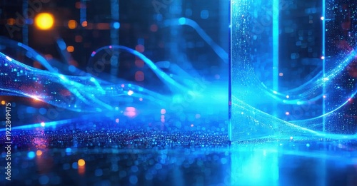Abstract digital landscape. Glowing blue lines, particles create futuristic scene. Bright orange light source visible. Dark background emphasizes luminosity.