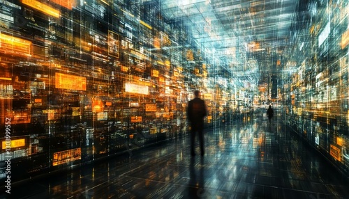 Abstract Digital Landscape with Silhouetted Figures in Motion