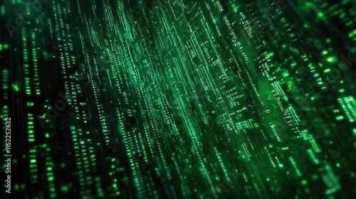 Abstract digital matrix background with glowing green binary code and data streams.