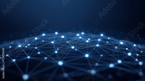 Abstract digital network background with connected white dots and lines forming a polygonal mesh structure on a dark blue gradient background, futuristic technology style,