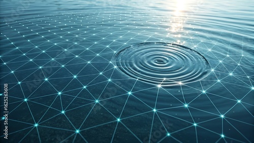Abstract digital network overlay on rippling water surface with sunlight reflection creating a sense of connection and flow