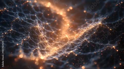 Abstract digital network visualization featuring glowing orange particles flowing through dark undulating neural pathways with bokeh effects