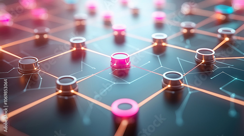 Abstract Digital Network with Nodes and Connections in Pink and Blue Tones