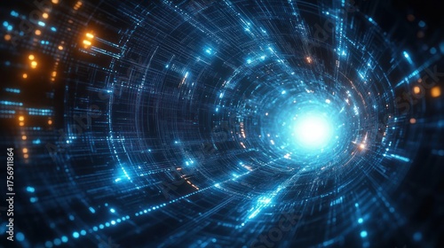 Abstract digital tunnel formed by glowing blue and orange lights representing data flow or futuristic technology with a bright light at the center