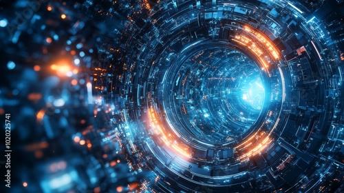 Abstract Digital Tunnel with Glowing Orange and Blue Lights