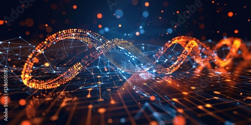 Abstract digital wave composed of glowing particles and interconnected lines, representing data flow and technology, set against a dark background filled with colorful bokeh lights