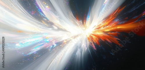 Abstract dynamic light explosion with intense radiant beams in white, orange, and blue hues emitting energetic flow against dark background