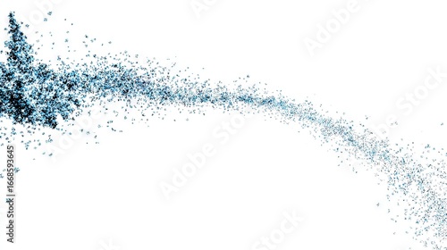 Abstract dynamic particle flow in blue tones forming scattered motion trail across white background creating modern artistic minimal composition