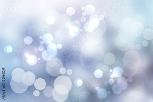 Abstract festive gradient light blue gray silver bokeh background texture with white bokeh lights. Beautiful backdrop with space for christmas, invitation or other holidays.