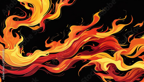 Abstract fiery background. Dynamic swirling flames in red, orange, and yellow hues on a black backdrop. Ideal for designs needing energy, passion, or heat.
