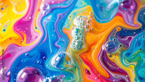 Abstract fluid motion background with multicolored bubbles, swirling liquid patterns.