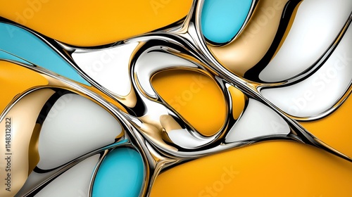 Abstract Fluid Shapes with Blue, Yellow, and Metallic Surfaces Creating a Modern Background Design
