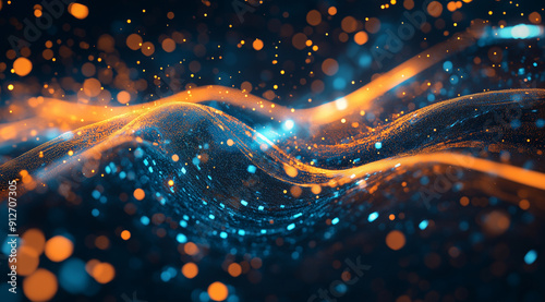 Abstract futuristic background with orange and blue glowing waves of light particles, bokeh lights and digital connections in dark space for science or technology concept, Generative AI