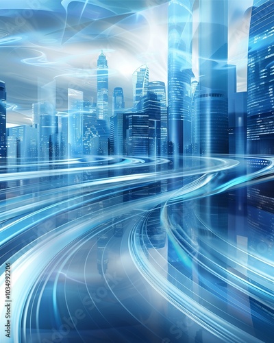 Abstract futuristic business landscape with transparent data streams flowing over a cityscape, representing the role of technology in driving business growth