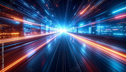 Abstract futuristic digital highway with glowing neon lights and light trails, representing speed and technology