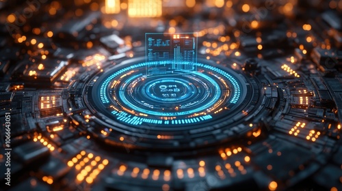 Abstract futuristic technology background with glowing blue and orange lights on a circuit board.