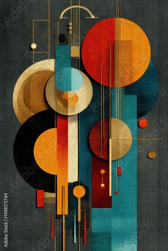 Abstract geometric artwork featuring colorful circles and lines in modern design