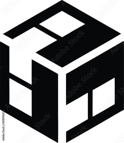 Abstract geometric cube shape icon, black and white, isolated on white background