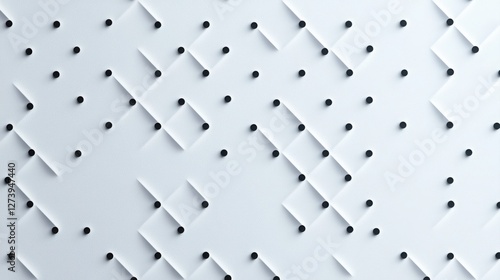 Abstract geometric pattern with layered shapes and dots on a smooth white background.