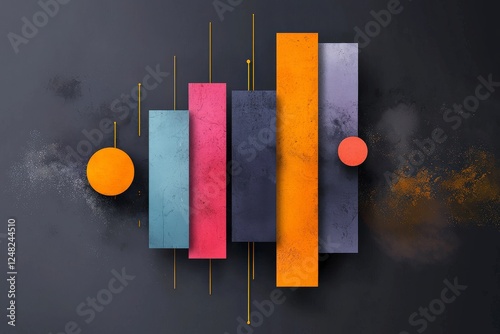 Abstract geometric shapes and vibrant colors create modern art composition on dark textured background