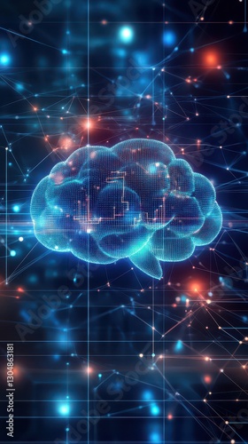Abstract glowing AI security brain analyzing cyber threats in a cloud computing ecosystem