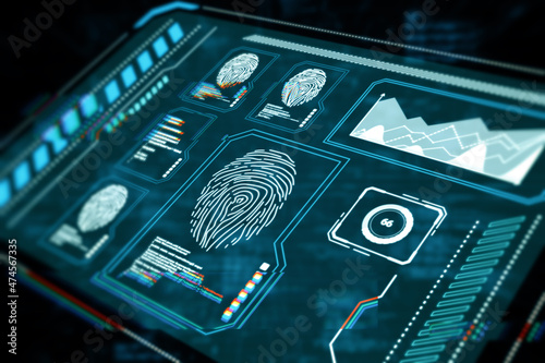 Abstract glowing blue fingerprint scanner interface on dark background. Technology, information and identification concept. 3D Rendering.