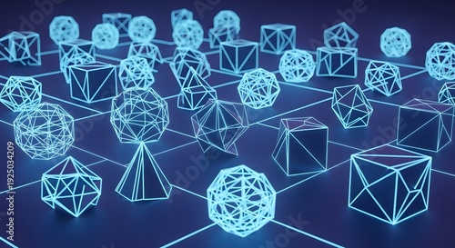Abstract glowing blue wireframe geometric shapes connected in a digital network for technology and data concepts