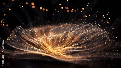 Abstract golden light trails and sparkling particles create a mesmerizing and elegant background for technology or design projects and presentations