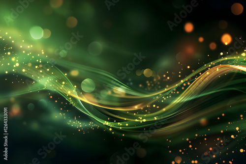Abstract green and gold wave patterns with glowing particles creating a dynamic background