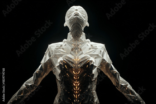 Abstract human figure sculpture made of sharp metallic shards with internal warm light on black background.
