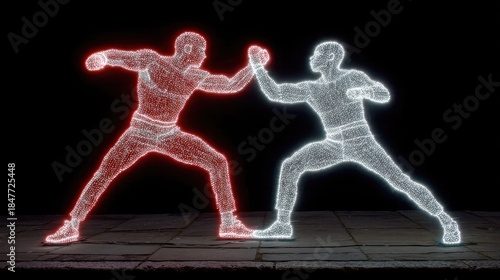Abstract illustration of two figures boxing in a futuristic illuminated style