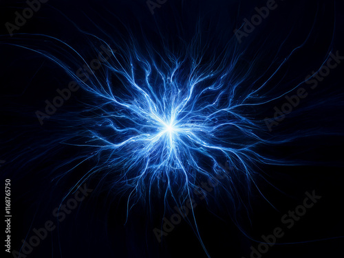 Abstract image depicting a vibrant blue energy burst, radiating outward in intricate, glowing tendrils against a deep black background. The effect is dynamic and ethereal.