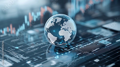 Abstract image of a digital globe surrounded by policy documents, concept of global economic governance