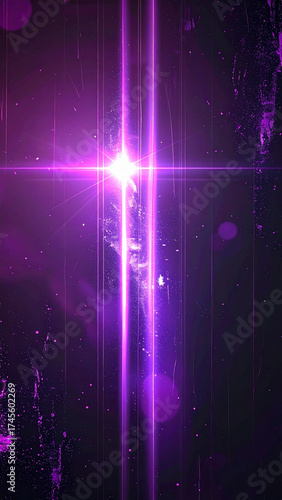 Abstract image of a glowing purple light beam with motion blur and scattered particles on a dark background, creating a dynamic futuristic and energetic visual effect.