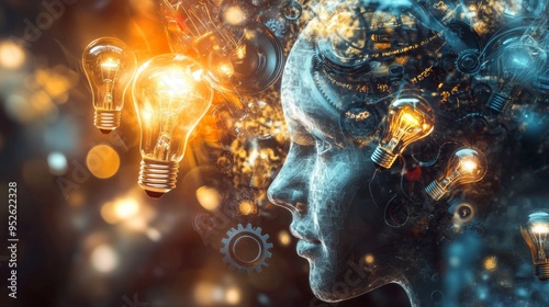 Abstract image of light bulbs and gears emerging from a person head, symbolizing the creative process and the generation of innovative ideas.