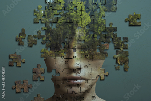 Abstract jigsaw puzzle face with forest elements perfect for nature themed designs, psychological concepts, or creative puzzle solutions.
