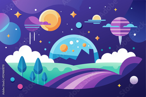 Abstract Landscape with Planets, Stars, and a Curved Road