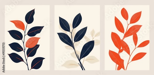 Abstract Leaves in Bold Orange and Navy Tones Across Three Vertical Panels on Off-White Background, Featuring Red and Blue Foliage