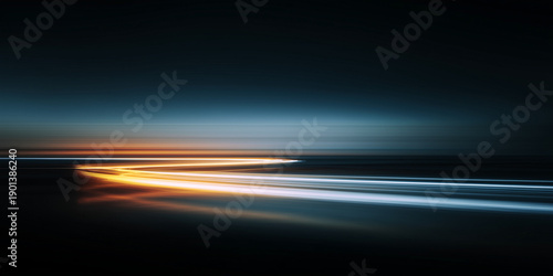 Abstract long-exposure light trail over dark horizon with warm and cold colors ideal for motion graphics, night photography and dynamic visuals