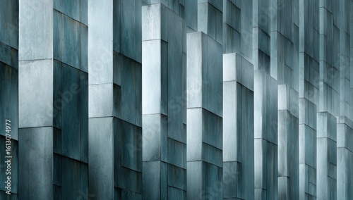 Abstract Metallic textured exterior of a building with repeating vertical columns, creating a rhythmic, industrial facade. Subtle color variations add depth