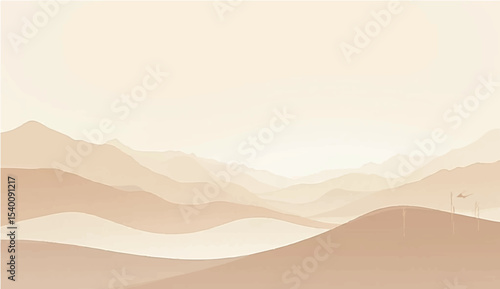 abstract Minimal beige landscape with soft mountain silhouettes and over a calm lake. Vector background for nature-themed designs or tranquil scenes.