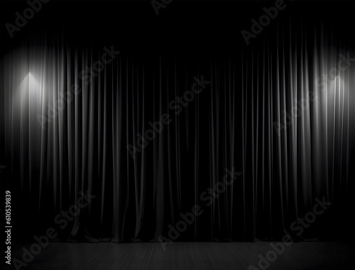 Abstract minimal concept. Luxury black opening curtain drapes empty wall stage with spotlight. Mock up template for product presentation. copy text space