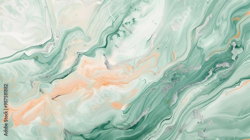Abstract mint green backdrop with marbled peach and silver paint creating a smooth airy design