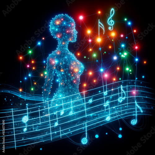 Abstract musical background. Connected dots. The connection between the neural network and music. Sheet music, piano, treble clef.