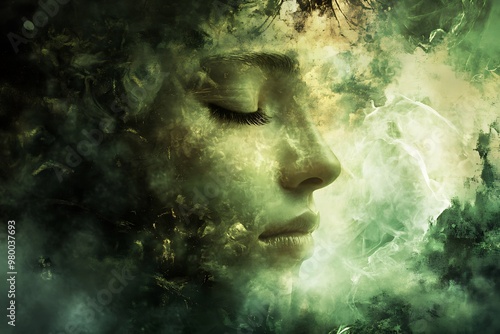 Abstract nature portrait of a woman with eyes closed and leaves in the background. Surreal art and nature concept.