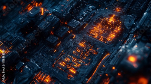 Abstract Neon Circuit Board with Glowing Orange Elements and Dark Background