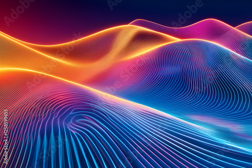 Abstract Neon Landscape: A mesmerizing abstract landscape of undulating lines and curves, illuminated in vibrant neon hues of orange, pink, and blue.