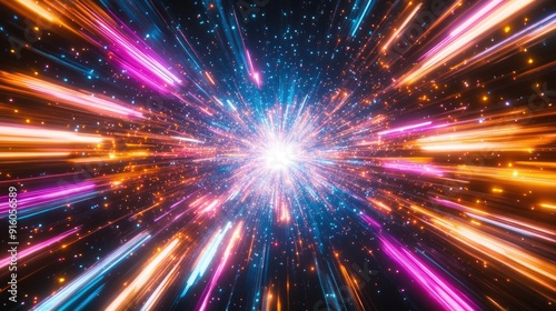 Abstract neon light rays in a starburst, galaxy explosion on black, creating a vibrant cosmic visual